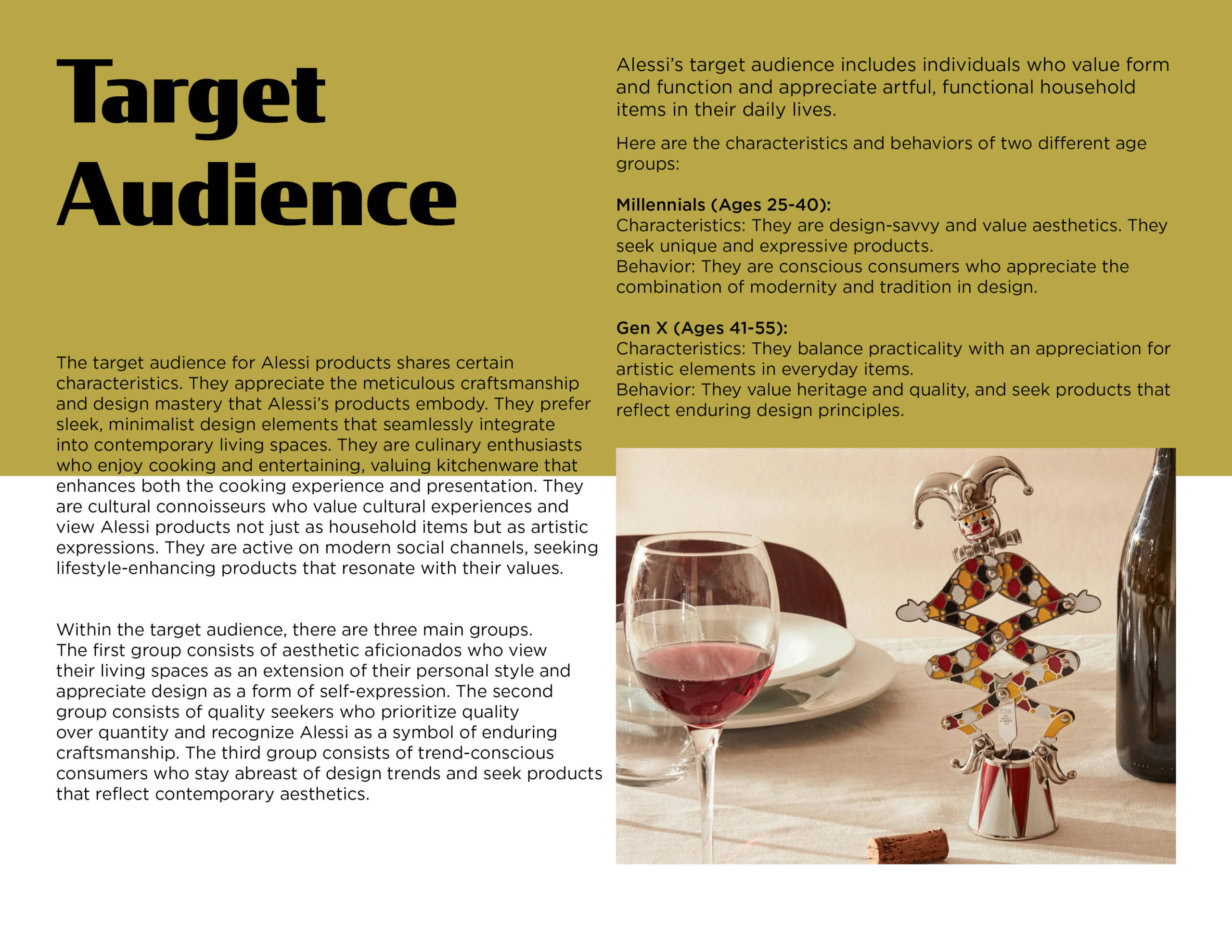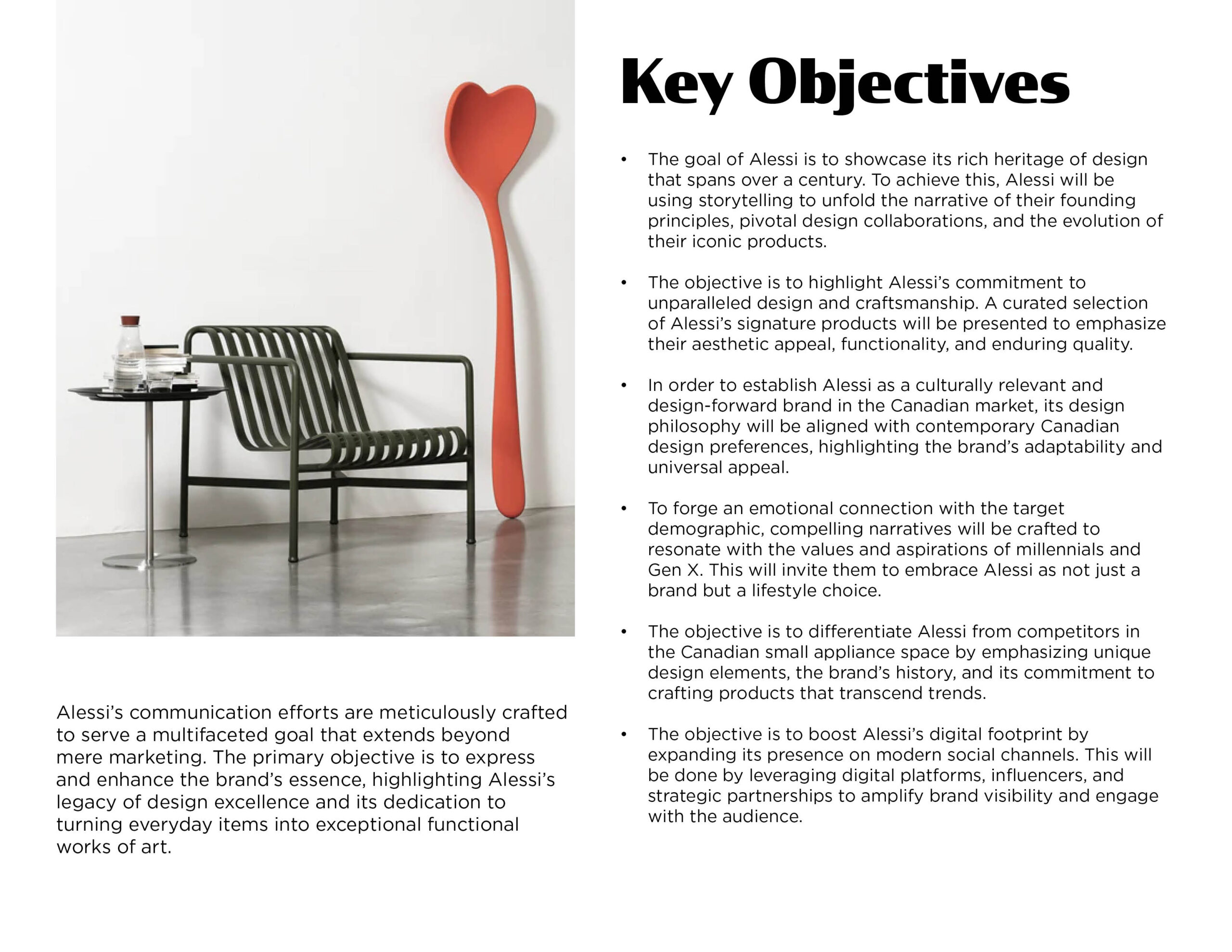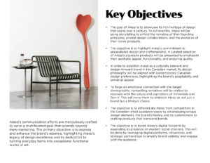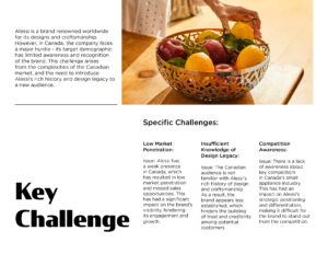 Alessi is a brand renowned worldwide for its designs and craftsmanship. However, in Canada, the company faces a major hurdle - its target demographic has limited awareness and recognition of the brand. This challenge arises from the complexities of the Canadian market, and the need to introduce Alessi’s rich history and design legacy to a new audience.