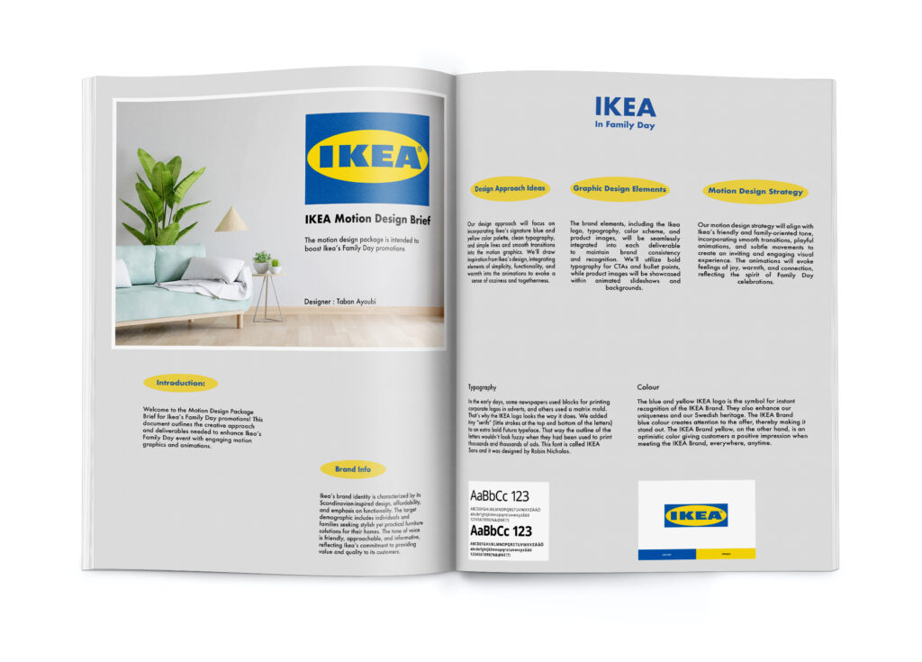 The motion design package is intended to boost Ikea’s Family Day promotions by creating engaging and visually appealing content to bring families together. Each deliverable, from logo animations to transition effects, will align with Ikea’s brand image and messaging. The design approach will draw inspiration from modern design principles, incorporating clean lines, minimalist aesthetics, and vibrant colors.