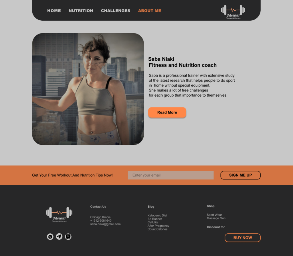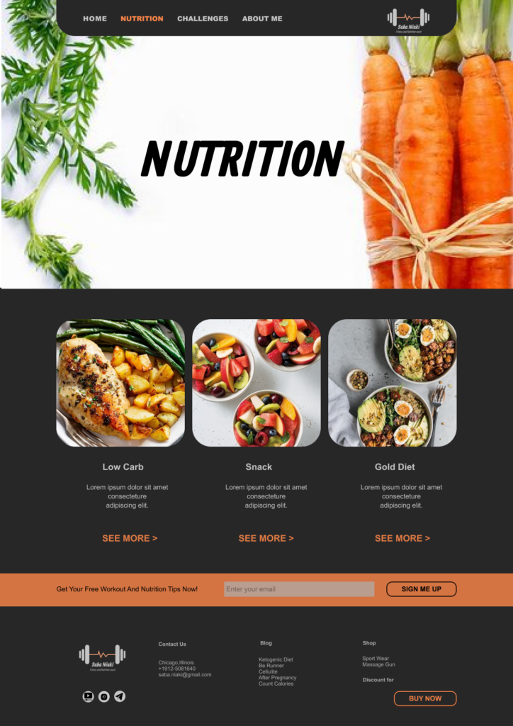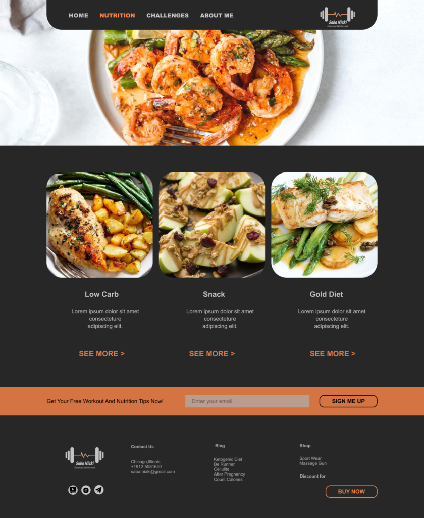"Welcome to the online hub of Saba Niaki, your dedicated personal trainer committed to helping you achieve your fitness goals and live a healthier lifestyle. Our website provides a seamless user experience, meticulously crafted by our UX/UI designer, to showcase Saba's empowering fitness classes and delicious nutrition recipes. Navigate effortlessly through our intuitive interface to discover a variety of workout sessions tailored to your needs, whether you're a beginner or a seasoned fitness enthusiast. Explore our comprehensive collection of nutritious recipes designed to fuel your body and support your fitness journey. With Saba Niaki's website, embark on a transformative wellness experience designed to inspire, motivate, and guide you towards a happier, healthier you."